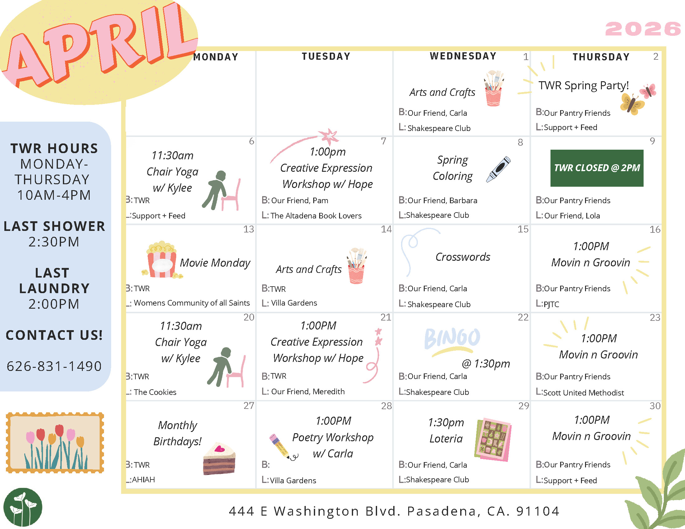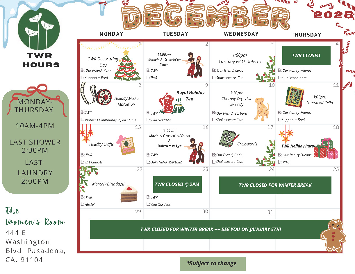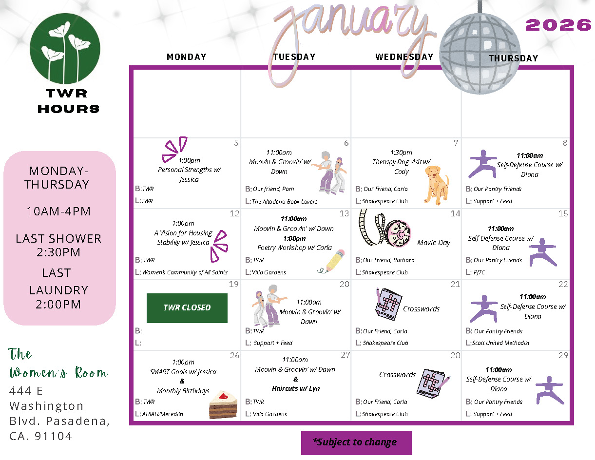 The Women’s Room is open Monday through Thursday, from 10:00 AM to 4:00 PM at 444 E. Washington Blvd., Pasadena, CA 91104. For more information, contact Assistant Director of TWR, Jenny Juarez, at jennyj@friendsindeedpas.org.